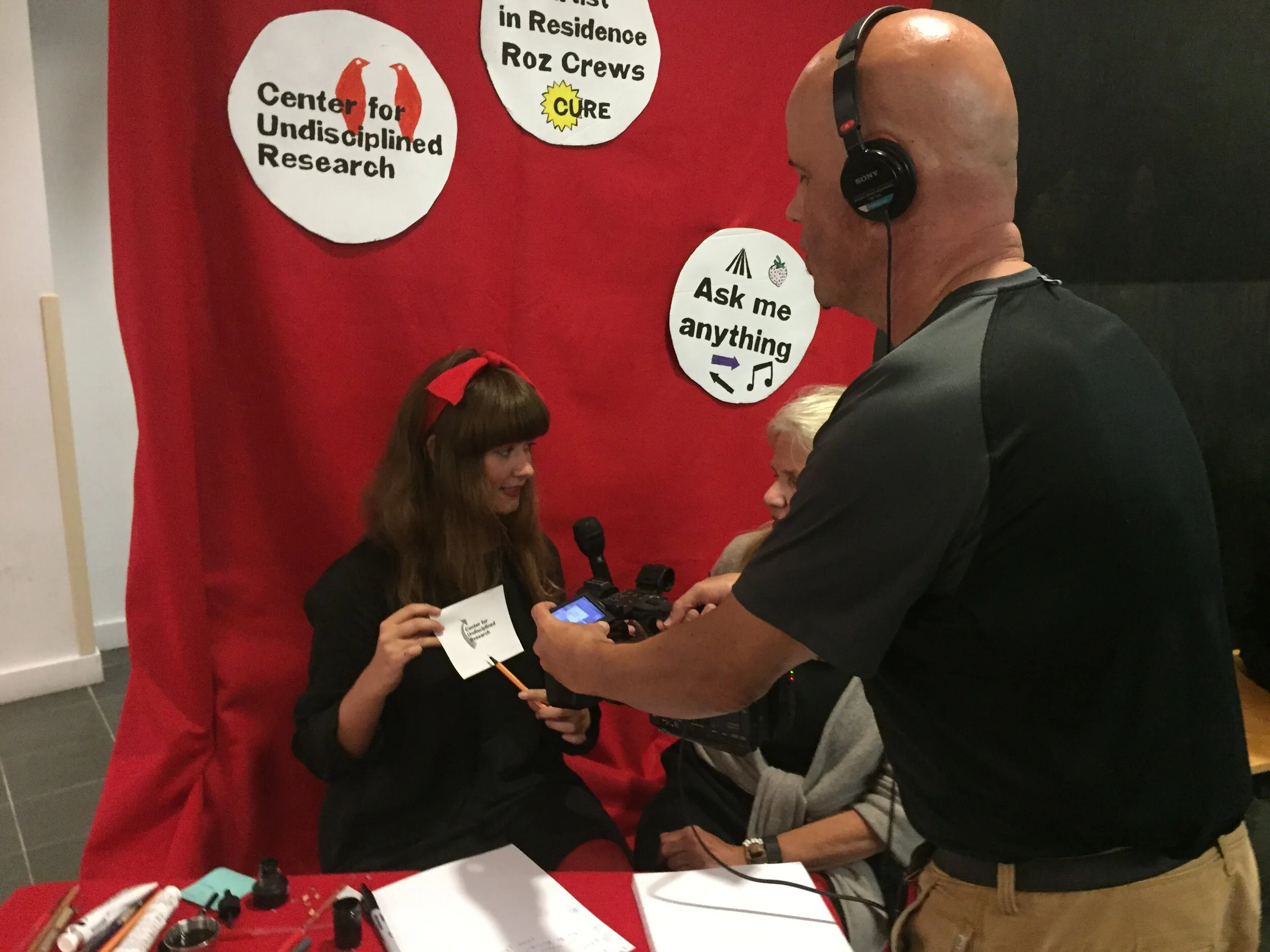 Here I am being interviewed by the local TV station during a performance called “Wouldn’t exist without your questions” (2017) where students at the University of Massachusetts Dartmouth and folks from the public could ask me anything, and I responded with a drawing they got to keep for free.