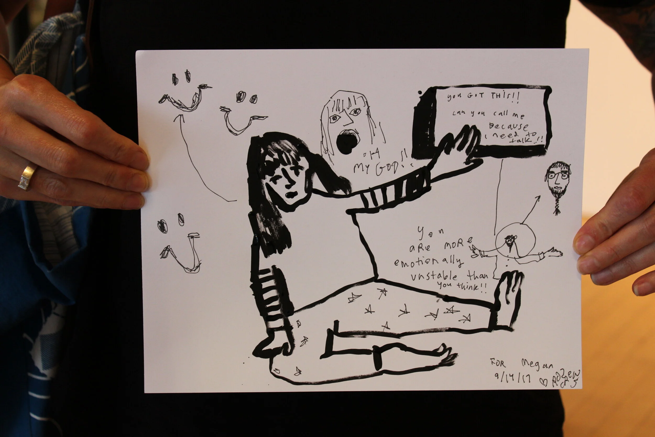 My handwriting enters my work at almost every turn, and I think of drawing as a key component of how I communicate with myself, my friends, and public audiences. In 2012, I stopped making drawings, and in 2014, I started again - just using black ink on paper. Eventually I introduced blue, and in 2017, I made a drawing with purple and yellow on white paper. From there, I began using all kinds of color in my drawings. Mostly I draw on 8.5” x 11” pieces of card stock, but occasionally, I draw on walls, shirts, or canvas. I often draw live as part of my performances or other people’s events. Sometimes the drawings are free and other times they are for sale at an accessible price. You can read about my perspectives on drawing in an interview I did for Ellen Mueller’s textbook Remixing and Drawing: Sources, Influences, and Styles.