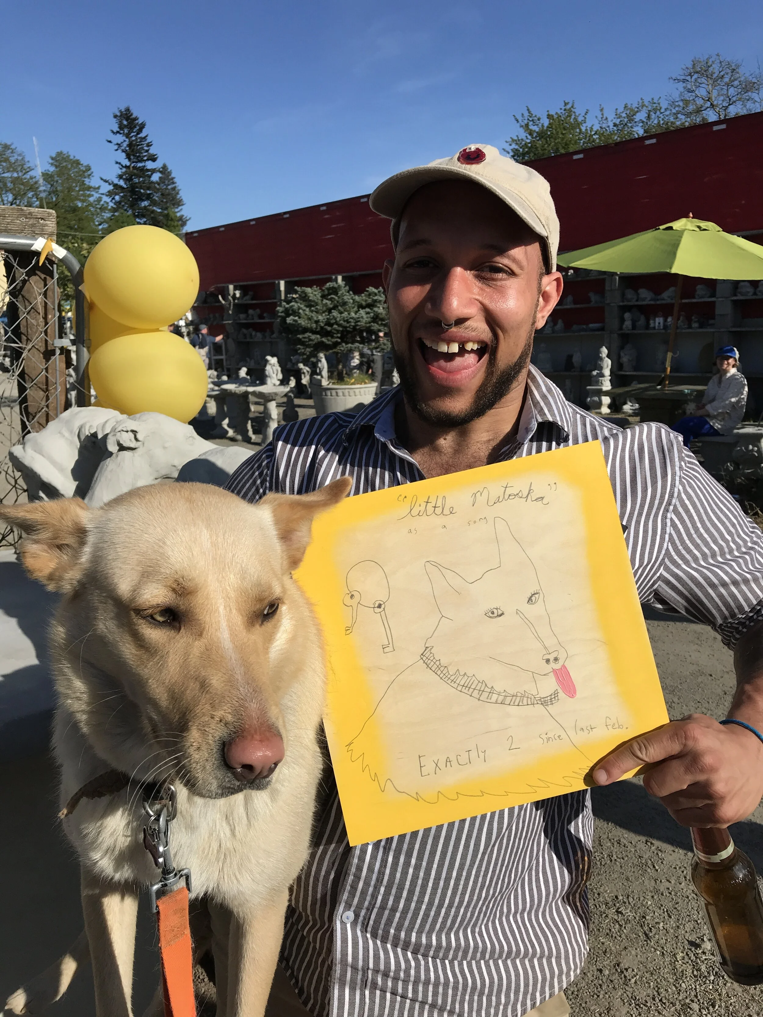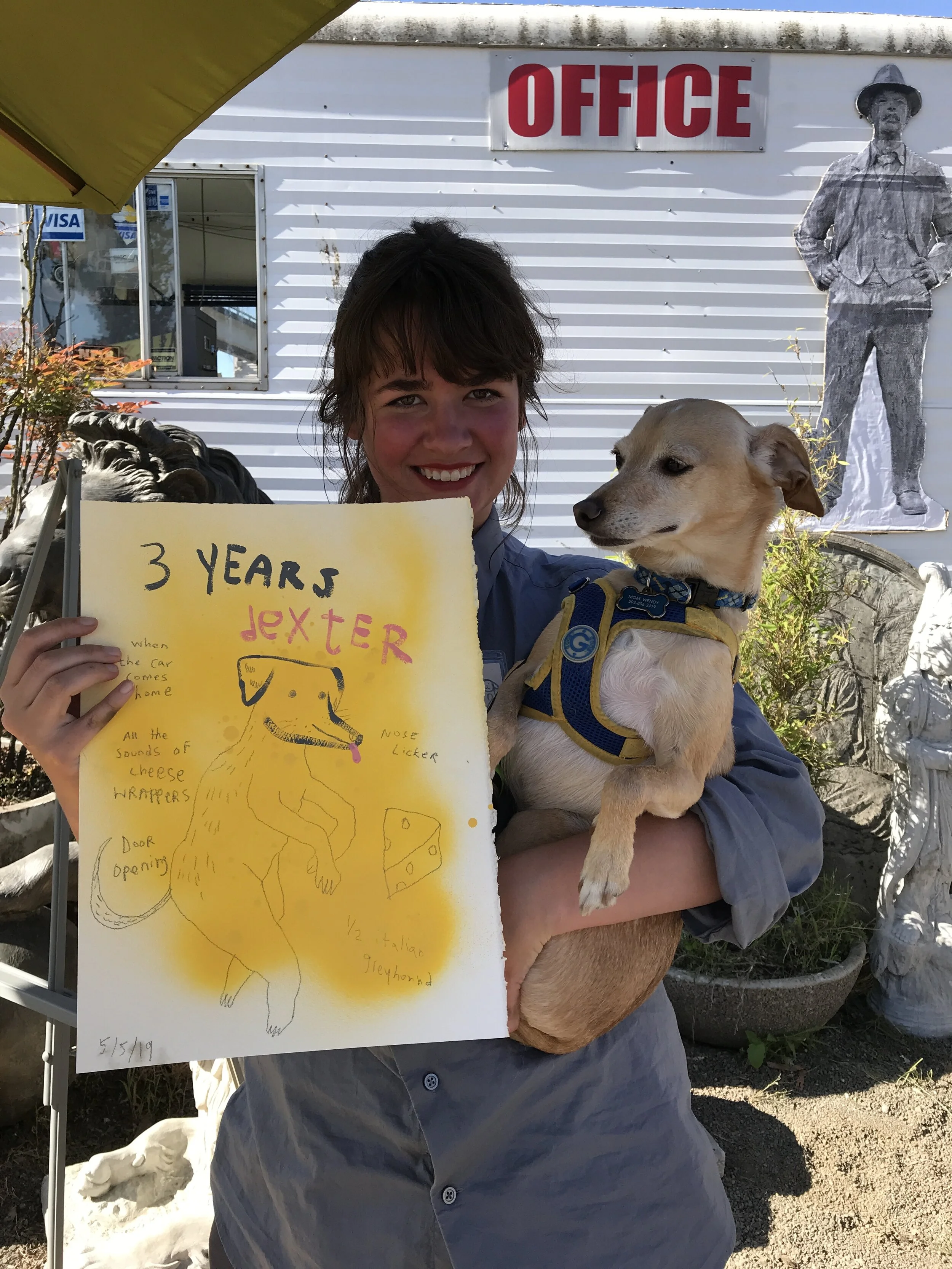 In honor of sculptor Jim Gion who committed his work to making portraits of dogs, I was invited to work as a dog portrait artist at the celebration of his life which was held at the A1 Bird Bath Company (2019). I dressed up as a cement sculpture and painted free dog portraits for anyone who attended the event.