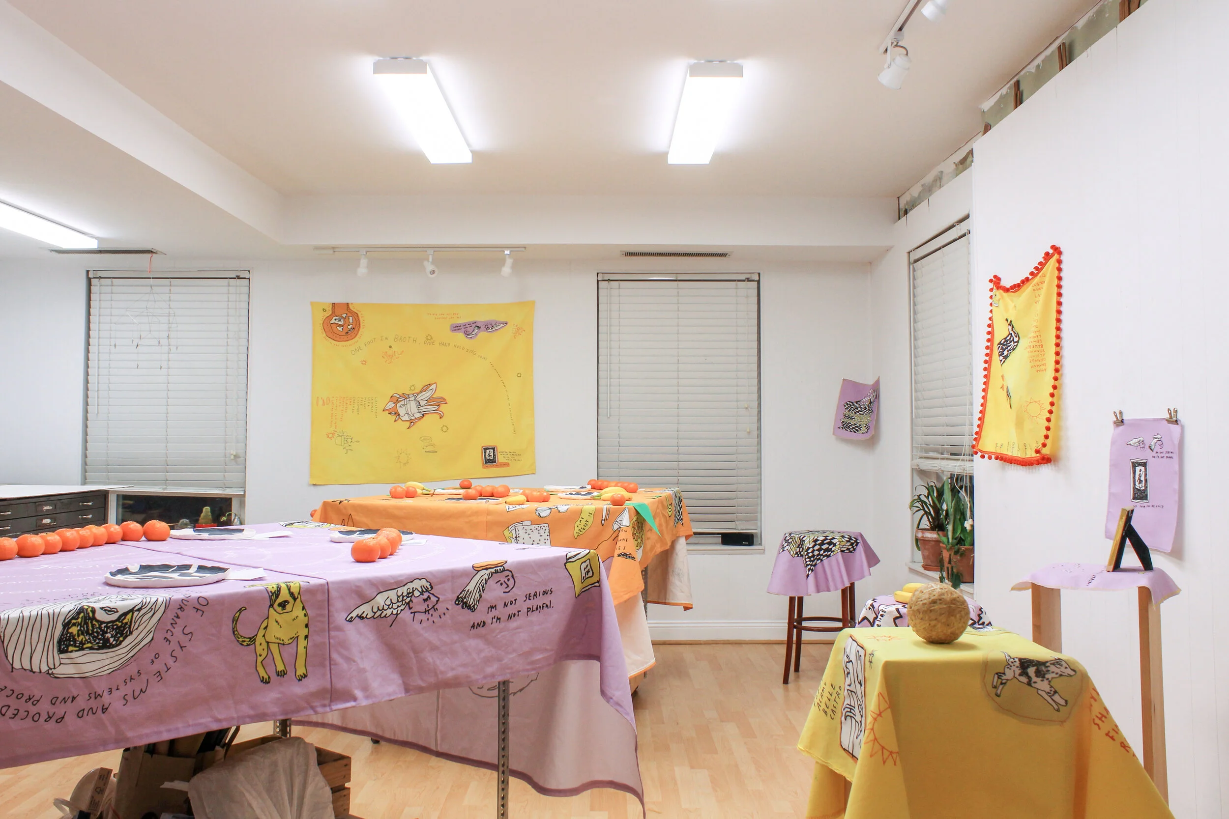 For thirty days, the curators sent me images of their space which transitioned from studio into gallery for exhibitions, and I made drawings about their daily life in the studio. Then I turned those into table cloths and napkins for a meal to be shared between friends. Instead of removing the furniture from their studio like they typically did for shows, I just covered each object with a table cloth.